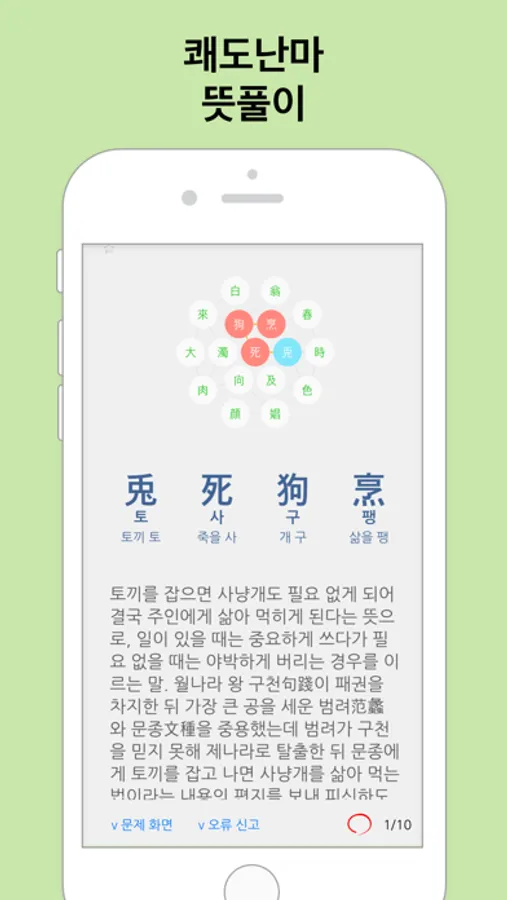 매일 10개의 사자성어에 도전하고 점수를 확인하세요.