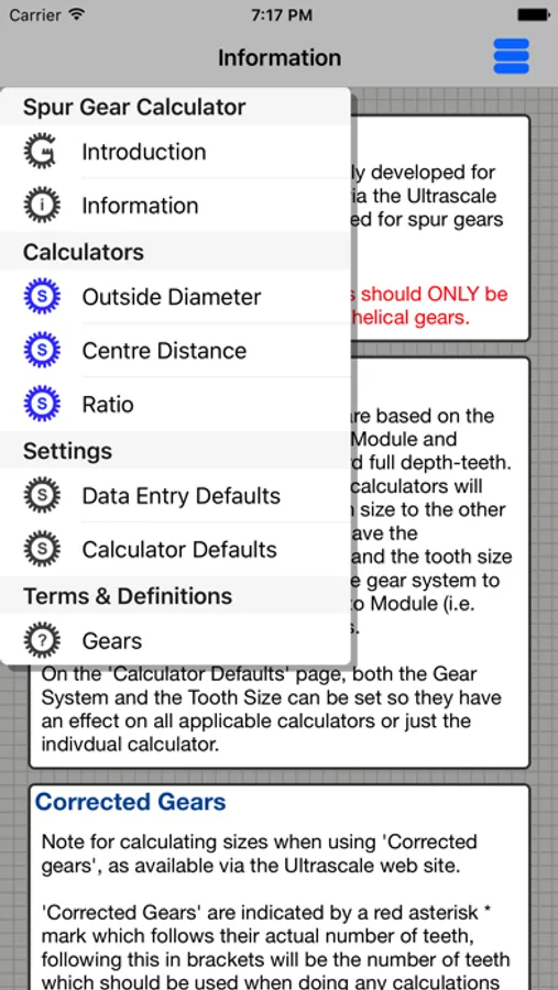 This is a specialised set calculators that uses the gear systems (Diametral Pitch or Module) and the number of teeth to calculate the Outside Diameter, Centre Distance and Ratio of Spur gears and pinions.