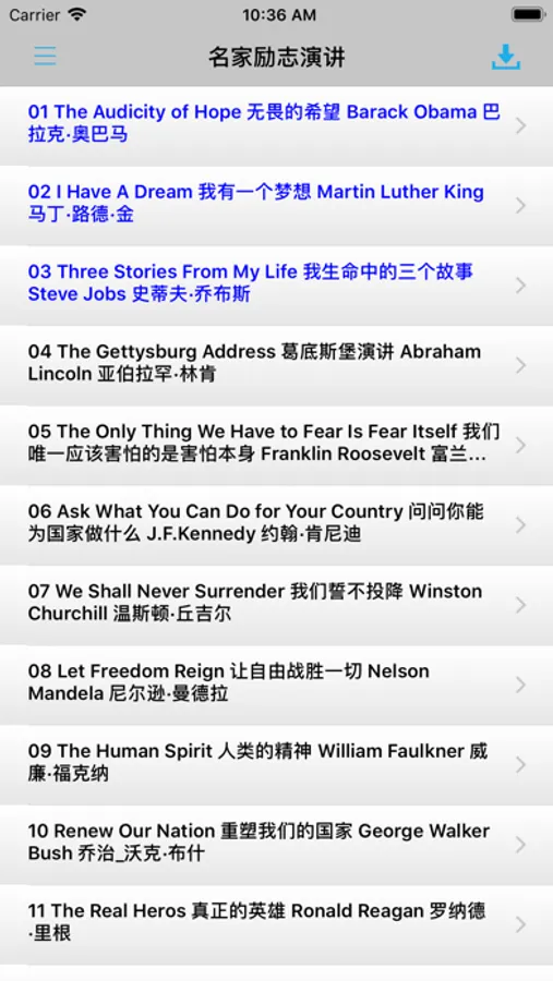 本应用精选的演讲可谓记录了时代的进步和历史重大时刻。例如由《时代》周刊权威评选出的十大毕业演讲,本应用就包括了乔布斯,J.K.罗琳和大卫·华莱士以及拉塞尔·贝克等人的时代之音。而由英国《卫报》评选出的最经典演讲则包括了英国二战时首相丘吉尔和大家熟知的铁娘子撒切尔夫人激情演讲等。