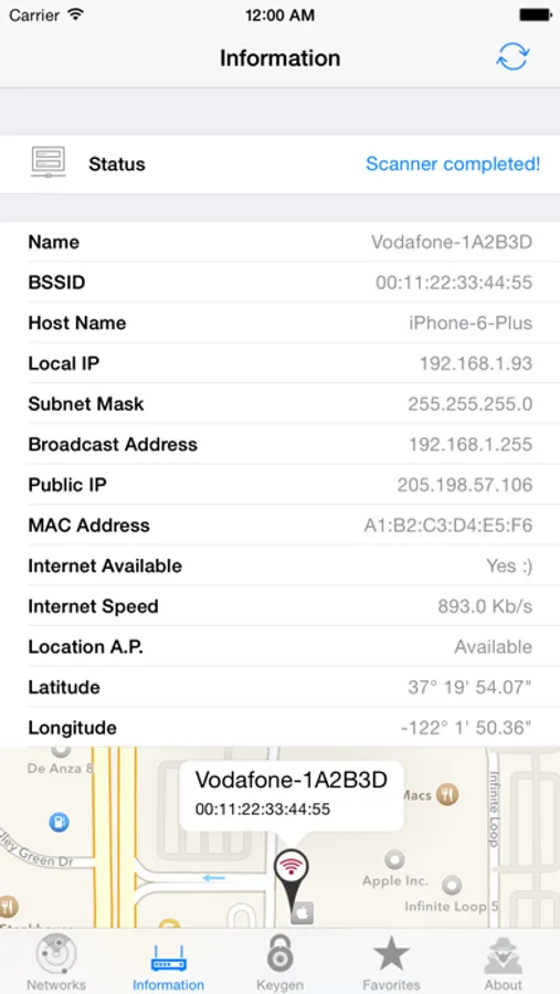 → On the Information tab, you can get data from the network to which you are connected such as Name, BSSID, Host Name, Local IP, Subnet Mask, Broadcast Address, Public IP, speed your internet connection and location AP (Access Point).