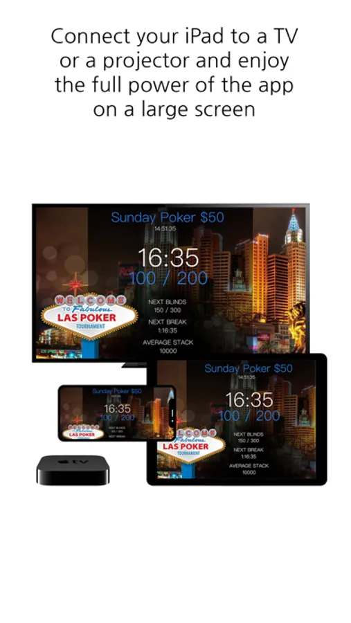 - The game screen can be displayed on the iPad, but it can also be exported to an external monitor (requires lightning/hdmi adapter or Apple TV). You can manage aspects of your tournament without clutter the display of the game screen to your players!