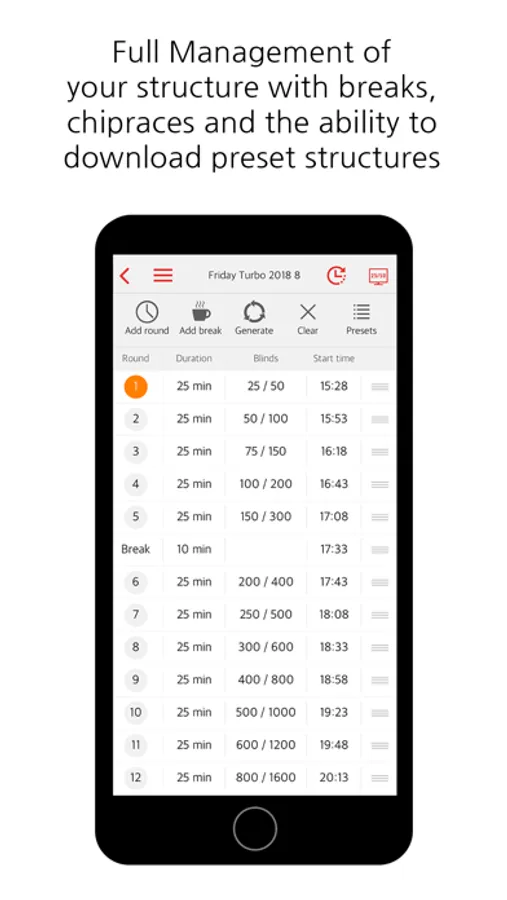 - Complete management of the structure, you can add round by round or generate instantly a structure through our structure generator. You can of course include breaks, chip races, etc.