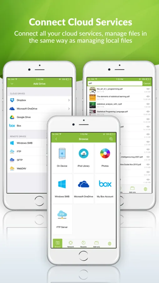 • Access popular cloud services Dropbox, Google Drive, Microsoft OneDrive, Box