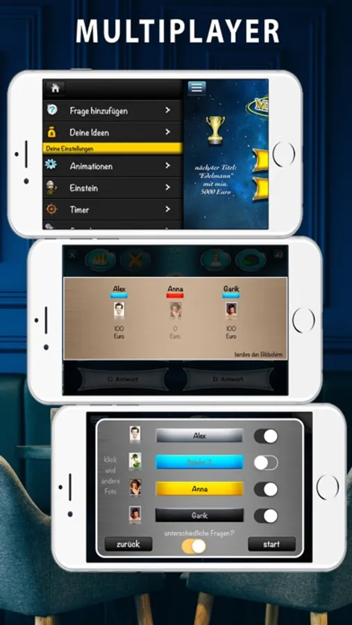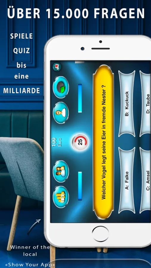 „Wer wird Milliardär“ basiert auf einem klassischen Multiple-Choice-Quizspiel. Um den Hauptpreis (Millionen virtuelle Euros) pro Spiel zu gewinnen, musst du 15 Fragen aus unterschiedlichen Wissensbereichen und in verschiedenen Schwierigkeitsgraden richtig beantworten.