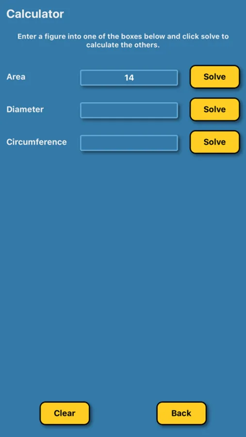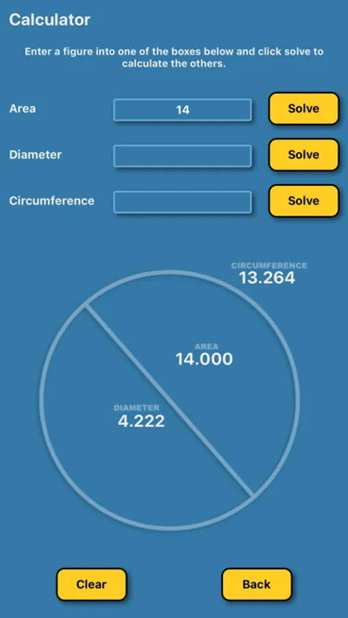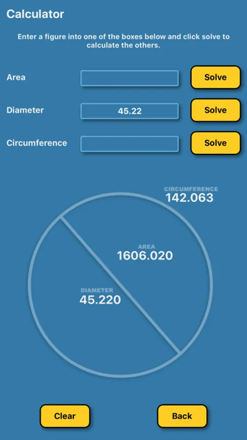 Simply enter either the diameter, circumference or area and the app will calculate the other two for you.