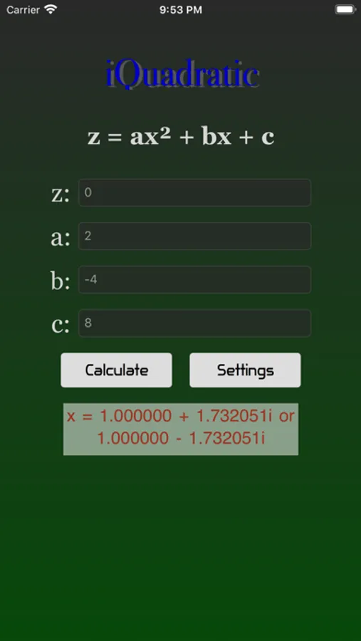Are you sick of the long and tedious quadratic formula? This app is for you! It calculates the values of x instantly! Includes support for complex numbers.