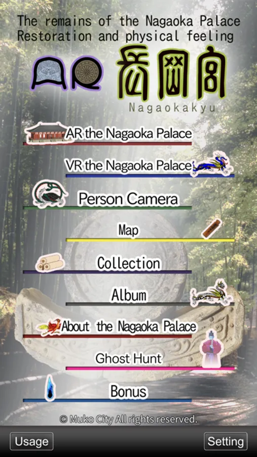 Historic sites of six areas of Kyoto Muko (Chodoin park, Daigokuden park, Dairi park, Imperial Palace inner bailey Mud-wall corridor(Former Ueda family residence), South Dairi park, The remains of mud wall) in, using the VR and AR this application, "Metropolitan Palace of ancient "the Nagaoka Palace"" it is an application that can experience but as if you were there in front of me.