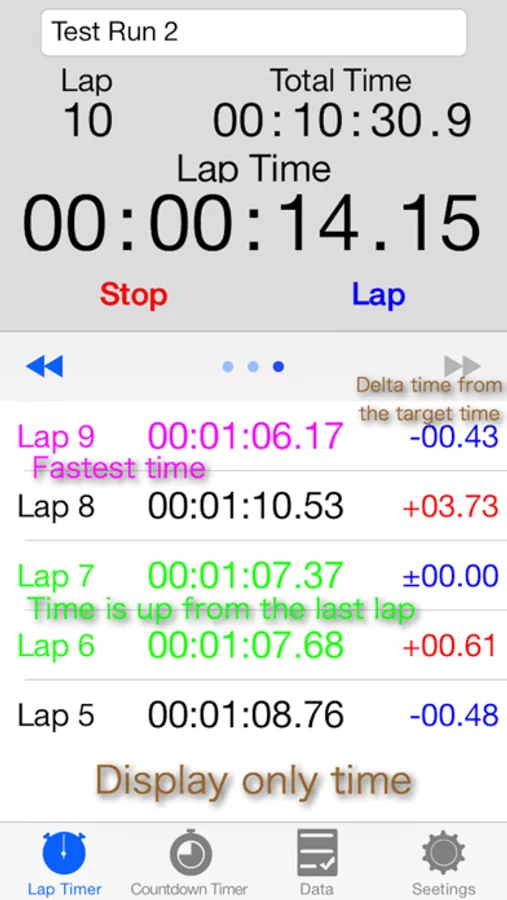 Lap times are saved as data.