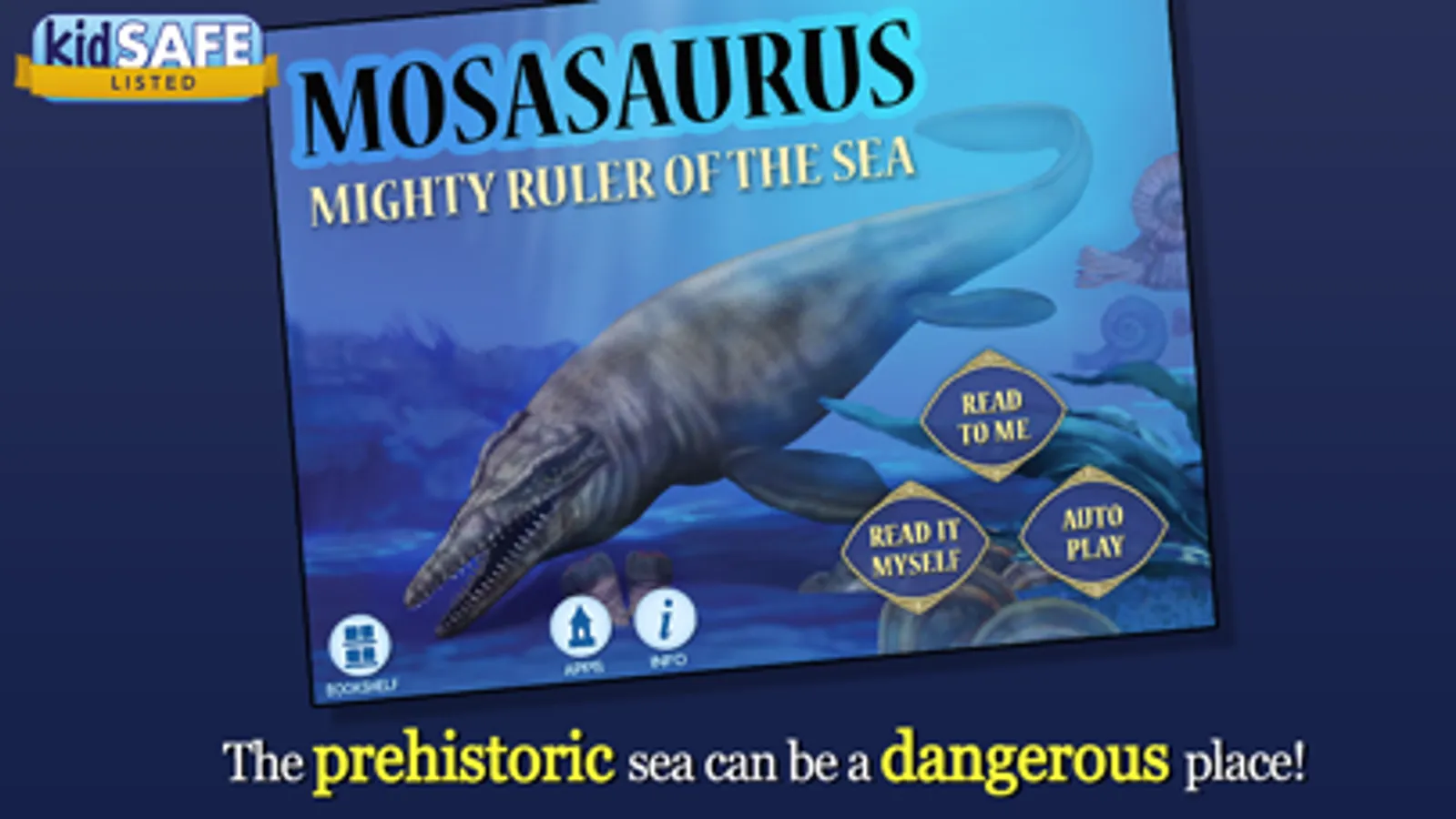 Dive inside the prehistoric sea and follow the story of the enormous Mosasaurus! Explore pictures, learn new vocabulary, and personalize the story with your own narration. Will Mosasaurus make his way through the water safely and find himself a tasty snack?