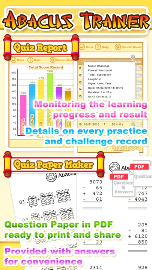 No matter practice or challenge modes, the performance, score and every detail will be recorded in report, which is useful for learning progress monitoring. The report records assist you to find out the strength and weakness, a customized approach in abacus training can be derived as a result.