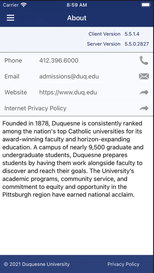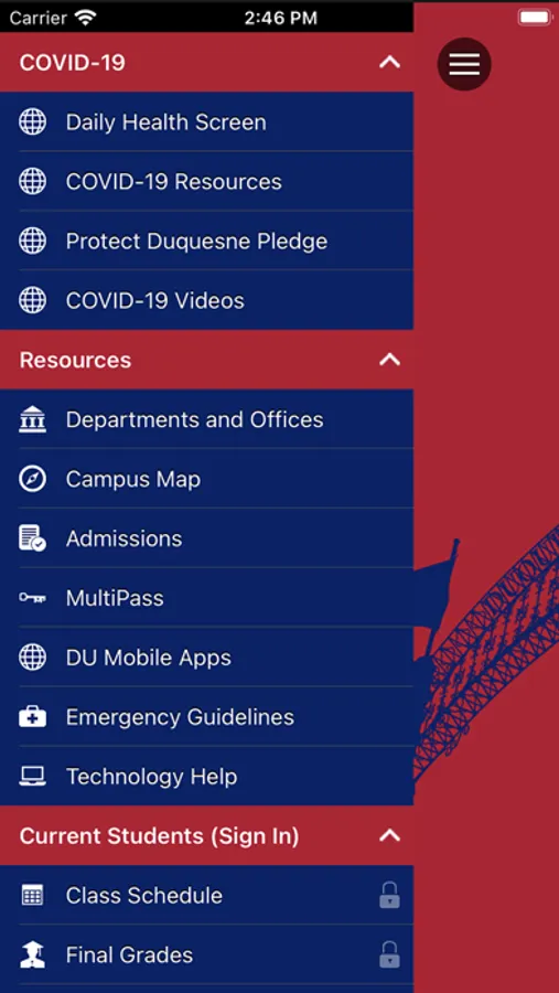 Stay connected to Duquesne with access to news, the University’s social media channels, Athletics news, a directory of departments and offices on campus, a faculty, staff and student directory, the campus map and more. Students can access a course list and their grades via MultiPass.