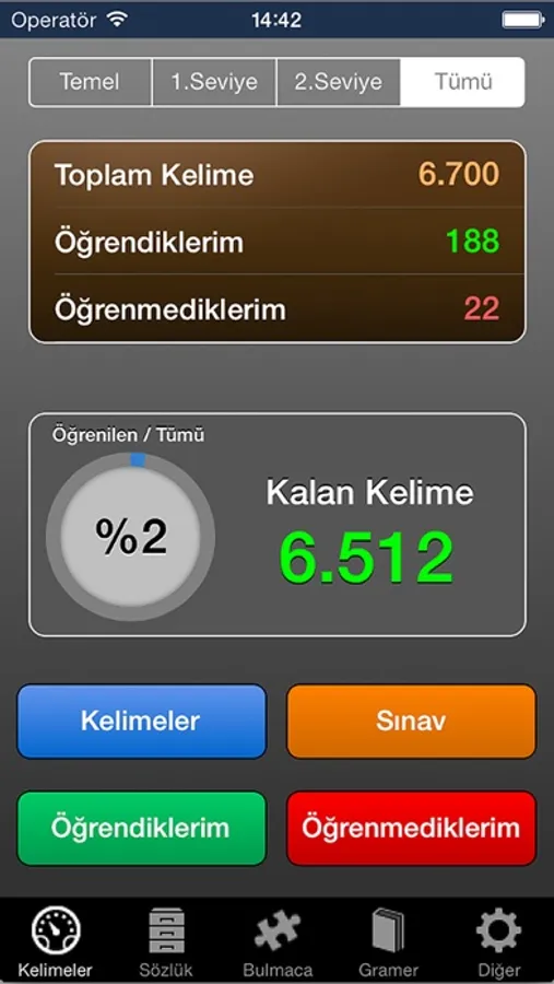 Sınav bölümünü kullanarak kelimeleri öğrenip öğrenemediğinizi test edebilirsiniz. Öğrenilen kelimeleri veya öğrenmediklerinizi iki ayrı liste olarak takip edebilirsiniz.