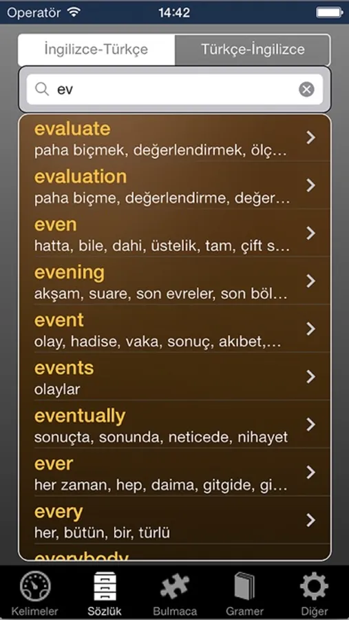 İngilizce/Türkçe veya Türkçe/İngilizce sözlük olarak kullanıp, istediğiniz kelimeyi arayabilirsiniz.