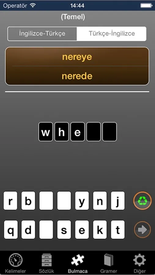İngilizce/Türkçe kelime oyunu ile hem kelimeleri öğrenip öğrenmediğinizi test eder hem de kelimelerin yazılışlarını öğrenirsiniz.