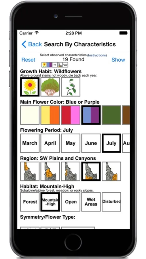 Idaho Wildflowers includes supporting documents with extensive information on the ecoregions of Idaho, descriptions of habitats found across the state, wildflower destinations with best time to visit, insights into how the climate influences the plant communities found here, as well as detailed instructions on how to use the app. Users will also find an extensive glossary of botanical terms, along with labeled diagrams of leaves, flowers, and inflorescences. Finally, detailed descriptions can be found for each family contained in Idaho Wildflowers. Tapping on a family name brings up a list of images and names for all species in the app belonging to that family.