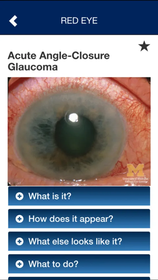 • Learn about an eye condition through concise bulleted text that addresses What is it? How does it appear? What else looks like it? What to do? and What will happen?