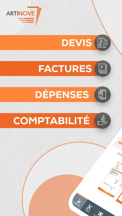 Bienvenue dans Artinove, l'application qui vous accompagne dans la gestion de la facturation de votre entreprise de manière facile. Cette application est une solution en gestion de comptabilité, TVA, trésorerie, paiement, facture et devis pro. Artinove est adaptée à tout type d'entreprise: TPE, PME, auto entrepreneur, missions de freelance, ainsi qu'à tout type de métier : BTP, artisan, coiffeur, plombier, avocat,...