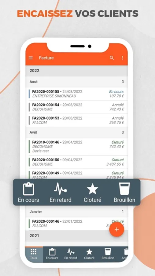 - Facturier avec suivi des statuts des documents pour relancer vos clients.