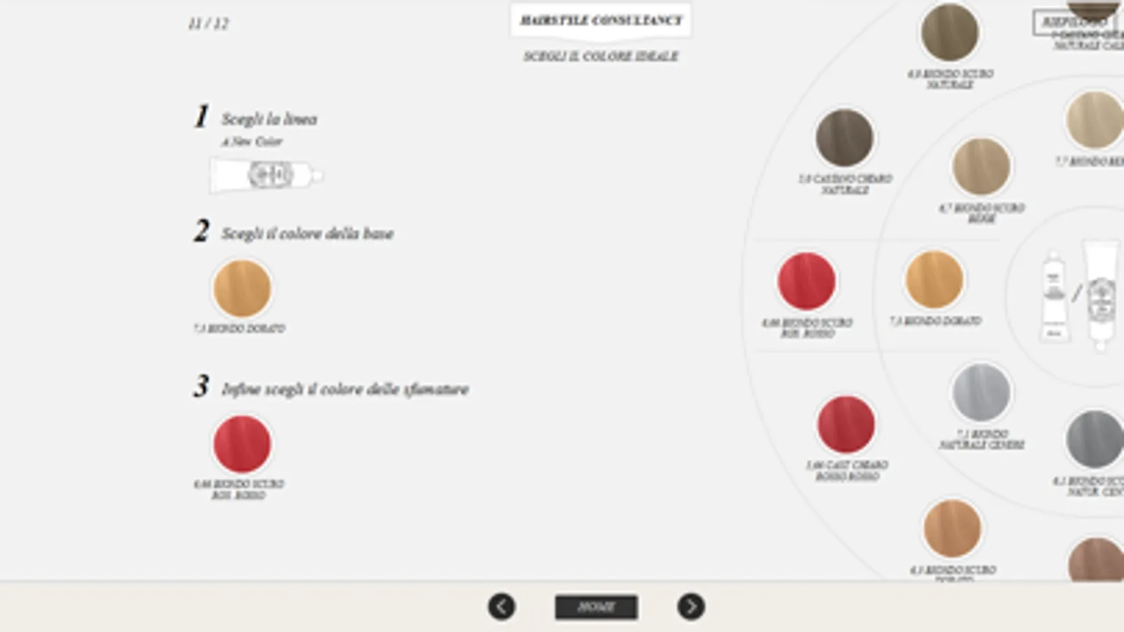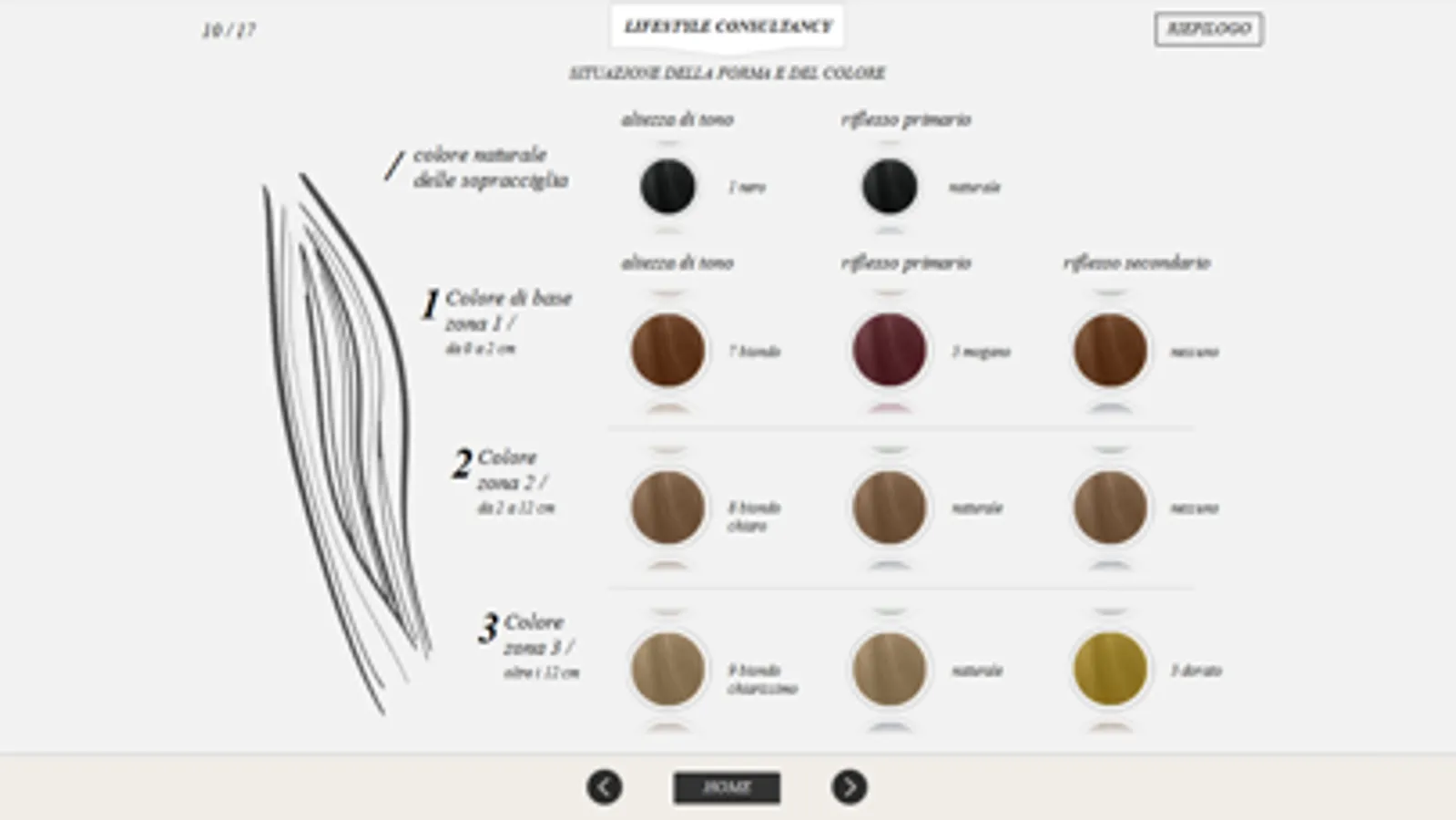 It is a simple, immediate and captivating tool that identifies features and wishes of each client through a series of fast questions and answers, providing three different types of solution: the color that best suits your personal chroma-type, positioning the color in relation to the client’s ultimate look, or the shade that best suits their lifestyle.