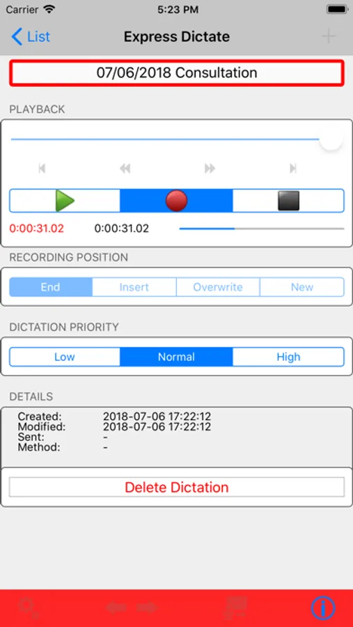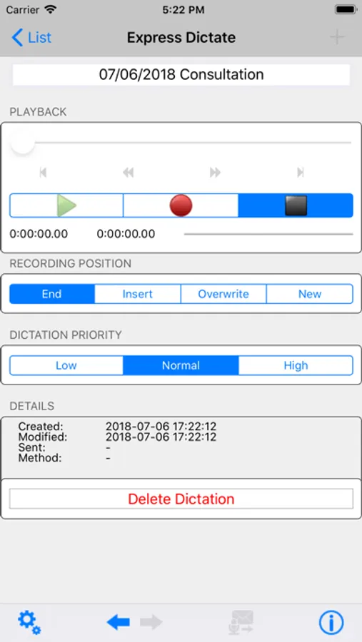 Express Dictate is a voice recording app for iOS. You dictate directly on your device using the controls. When done, tap send and the dictation will be compressed and sent to your typist by email automatically.
