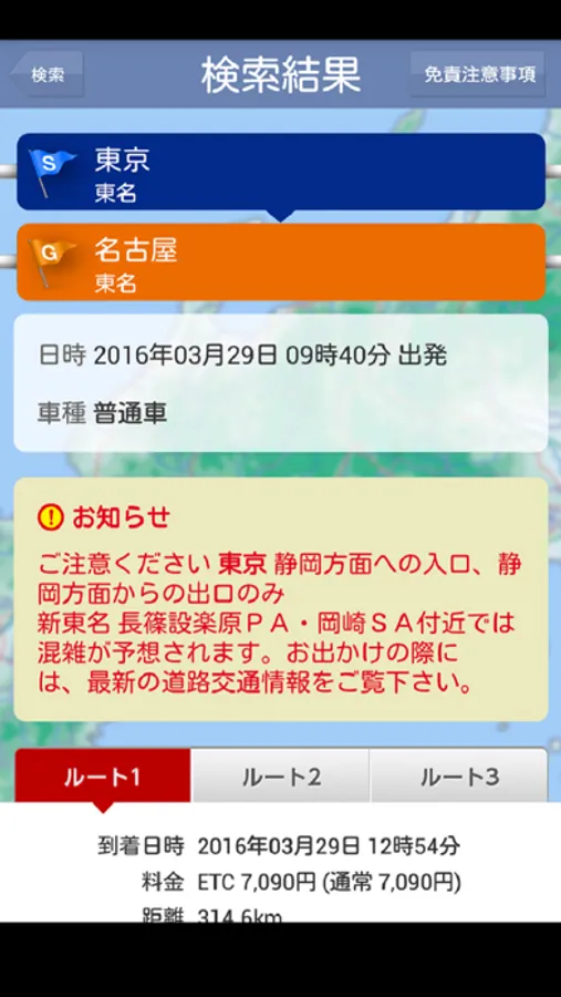 ・通常時の所要時間と渋滞予測を考慮した所要時間の両方を表示します。(ただしNEXCO3社エリアのみ)