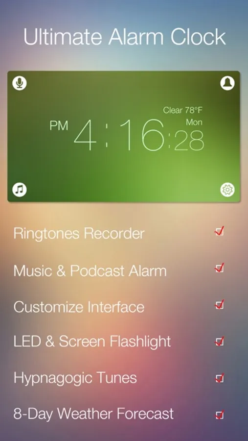 Daily Clock is an ultimate alarm clock with a lot of wonderful features. With it at night you can fall asleep to your favorite music ,podcasts, audiobooks or hypnagogic natural sounds via sleep tunes, and the volume will fade out to avoid a sudden disturbance. When the sun rises, Daily Clock will gently wake you up by fading in the ringtone, and you can choose a song or record an audio memo as the ringtone, you can also copy your audio files into the app via iTunes to use as ringtones.
