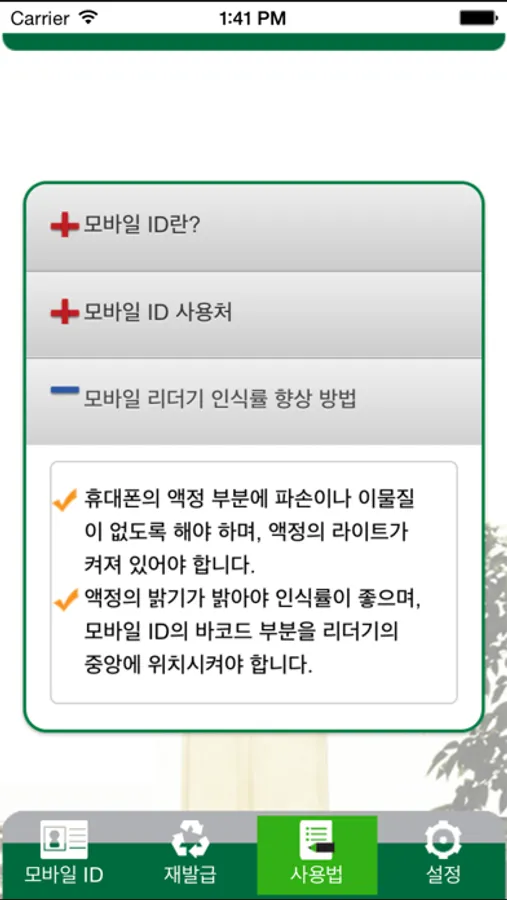 학생(신분증) 화면, 재발급 화면, 사용법, 설정 메뉴로 구성되어져 있습니다.