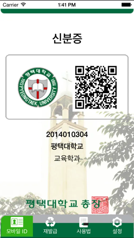 평택대학교내에서 RFID 신분증과 같이 스마트폰에서 사용하는 모바일 신분증 앱입니다.