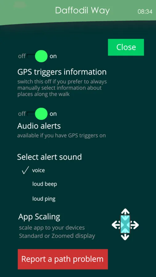 The app also features a path problem reporting tool, by which you can very quickly alert the Windcross Paths Group (a volunteer organisation that look after and promote the paths of the area) of any problem - broken style, fallen tree, blocked path, etc.