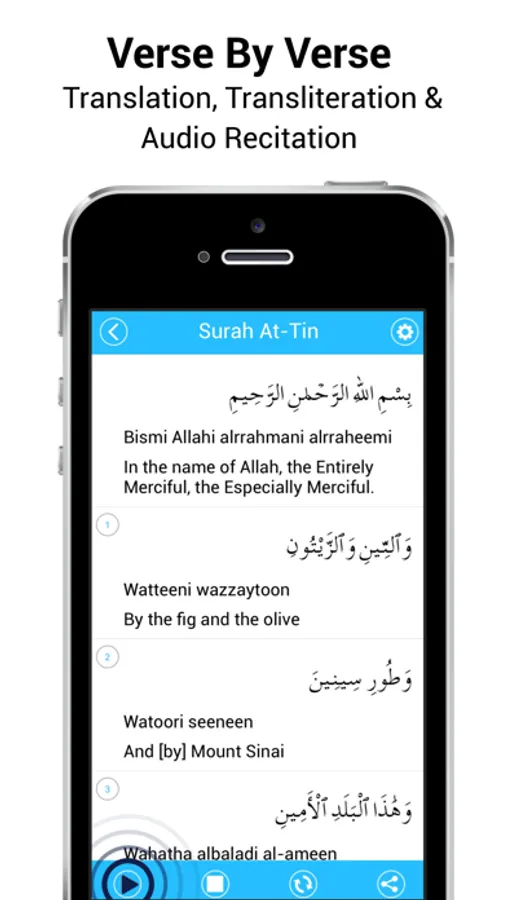 6. Play, pause, and repeat Ayah option for the convenience of users