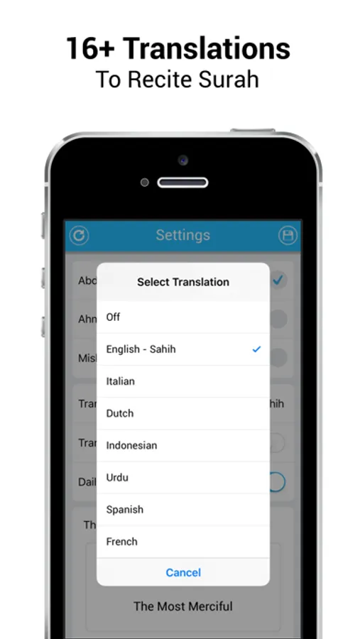3. Translation: Translation of each Surahs in 17 plus Languages including including (Bahasa Melayu, Hindi, English, Bengali (Bangla), Japanese, Urdu, Español, Simplified Chinese, Persian, Italiano, Netherlands and Bahasa Indonesia)