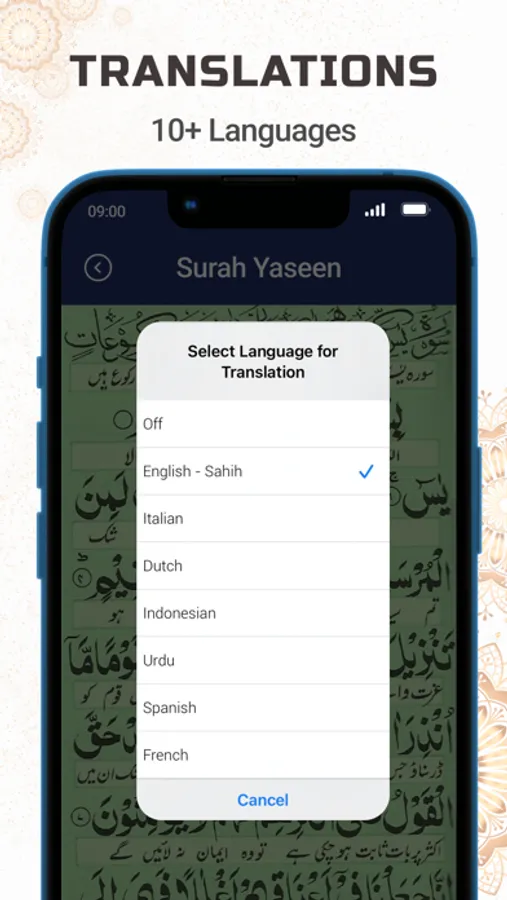 • Translation of entire verses of Surah in almost all languages including English, Hindi, Bengali, Spanish, Persian, Dutch, Chinese and Malay