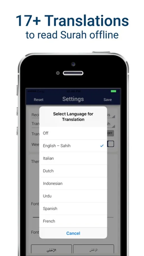 • Translation of the Ayahs in English including 16 other languages (Bahasa Melayu, Hindi, English, Bengali (Bangla), Japanese, Urdu, Español, Simplified Chinese, Persian, Italiano, Netherlands and Bahasa Indonesia)