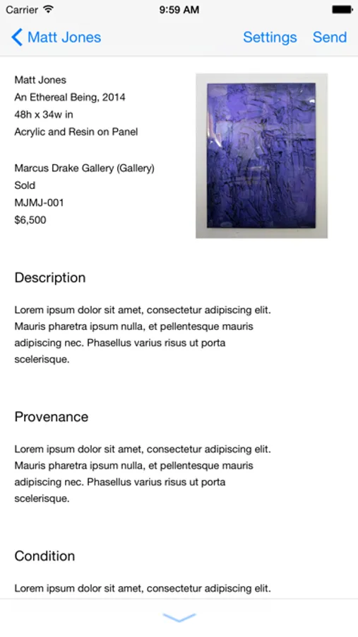 The galleryManager app is available to all active galleryManager subscribers. This is an ideal tool for presenting and emailing select groups of artwork and information while on the go. It syncs automatically with your galleryManager account—no exporting or uploading files or jpegs—and it works offline. The app is free for all subscribers and can be used on as many devices as you'd like.