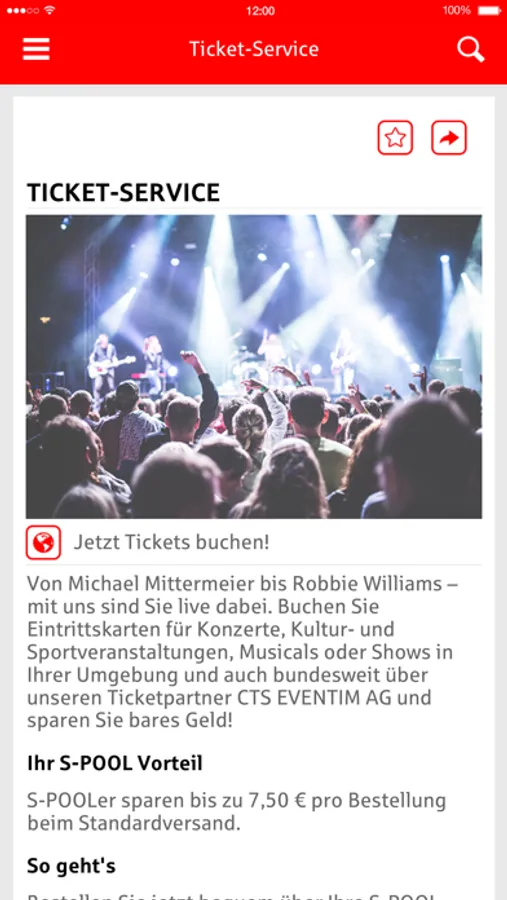 Ab sofort die Mehrwerte von S-POOL immer dabei haben. Für alle Kunden gibt es attraktive Angebote, vergünstigte Konzert- und Musicaltickets, die schönsten Reiseziele. Alle Neuigkeiten zu den S-POOL Vorteilspartnern in der Region haben Sie so immer dabei!