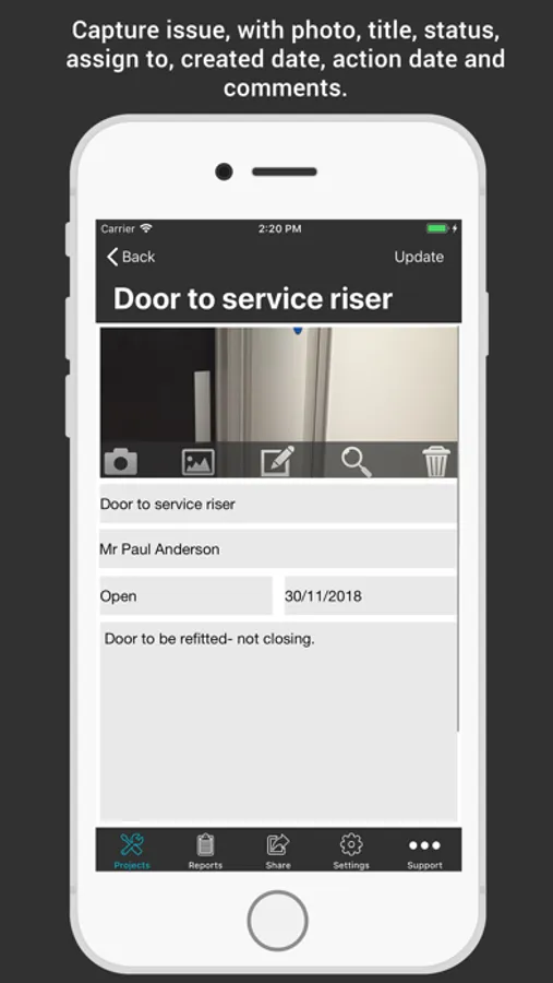 - Capture items with photos, titles, assignments, dates, status, and descriptions.