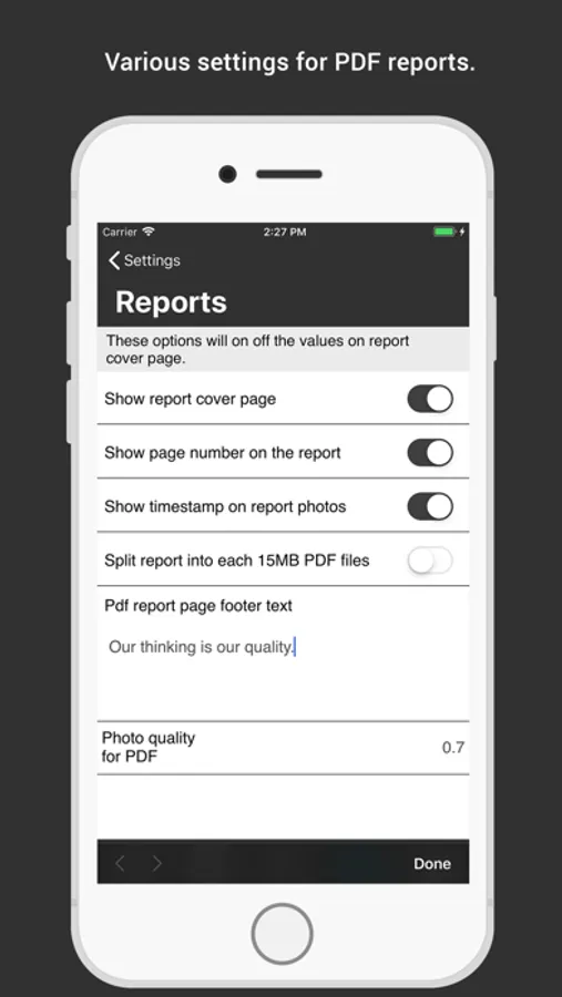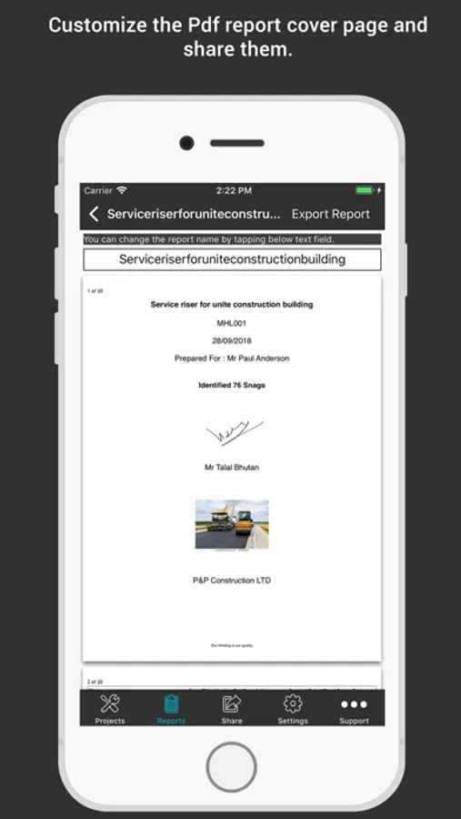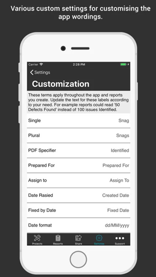 Tailor the app to your preferences by changing labels (e.g., snag, defect, observation) and date formats to match your terminology and requirements. Easily update your company name, logo, signature, and auditor name on the report from the app settings.