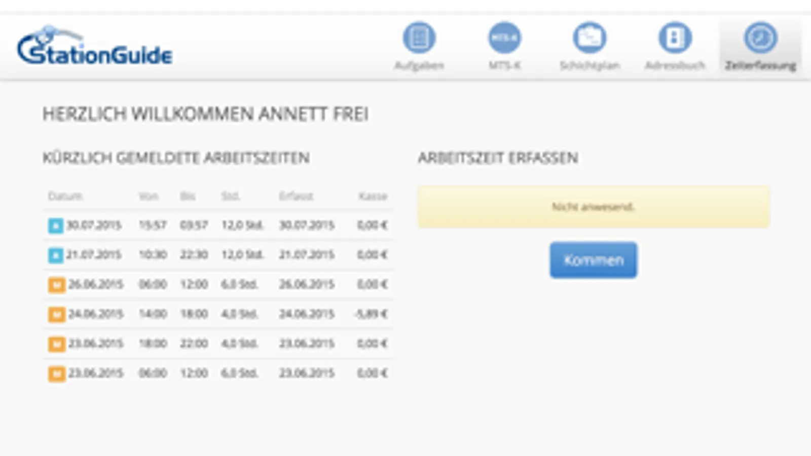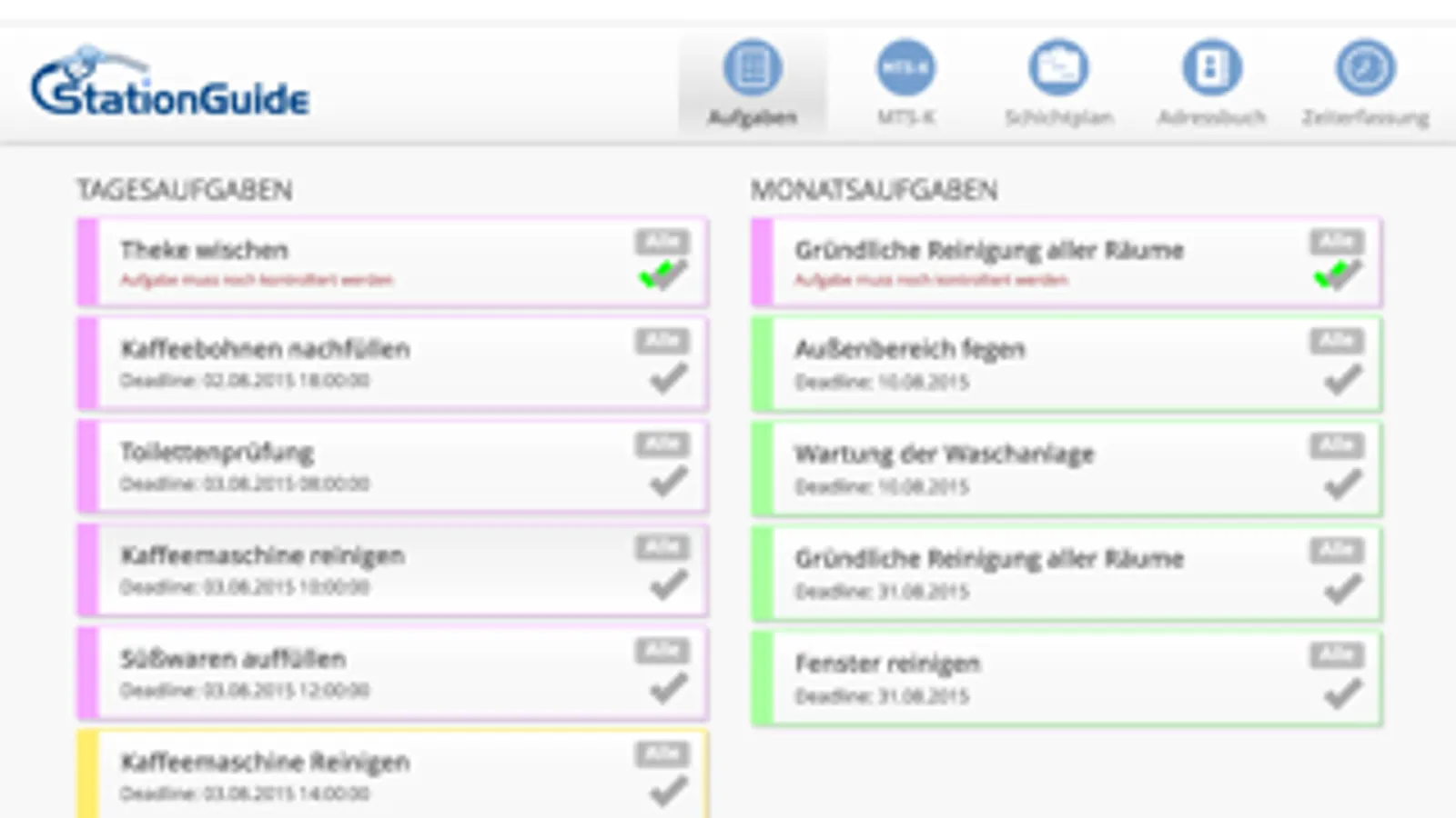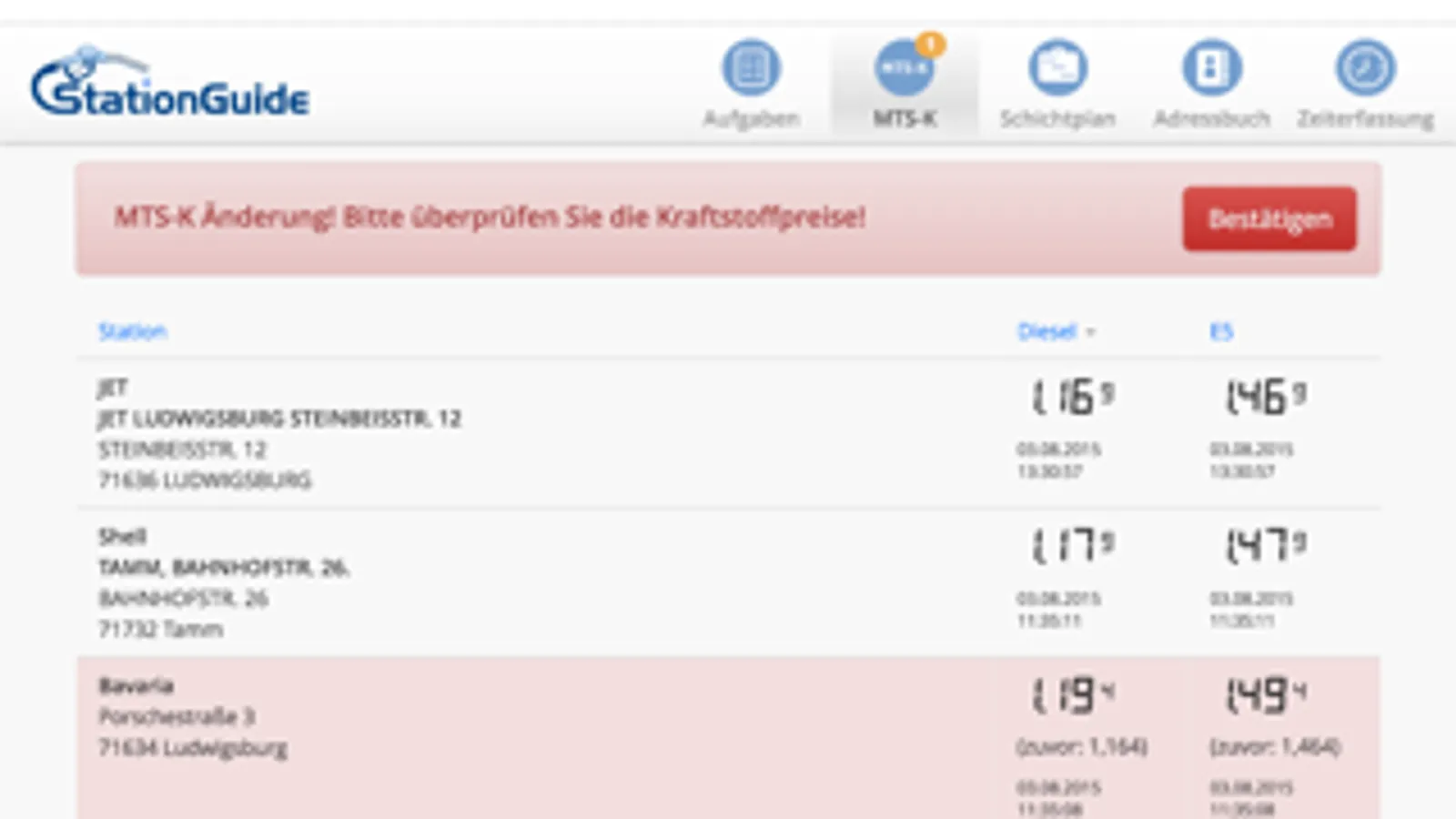 Via the StationGuide Terminal-App a simple tablet can be transformed into a terminal which can be used variously in your stations.Your employees can manage their daily routine - e.g. record their working hours, examine their scheduele or read and confirm the lastest announcements. Your employees will also be reminded of pending tasks and asked to confirm them. Furthermore they can find important contacs and documents in the blink of an eye. The integrated MTS-K will additionaly inform you about current price changings of your competitors.