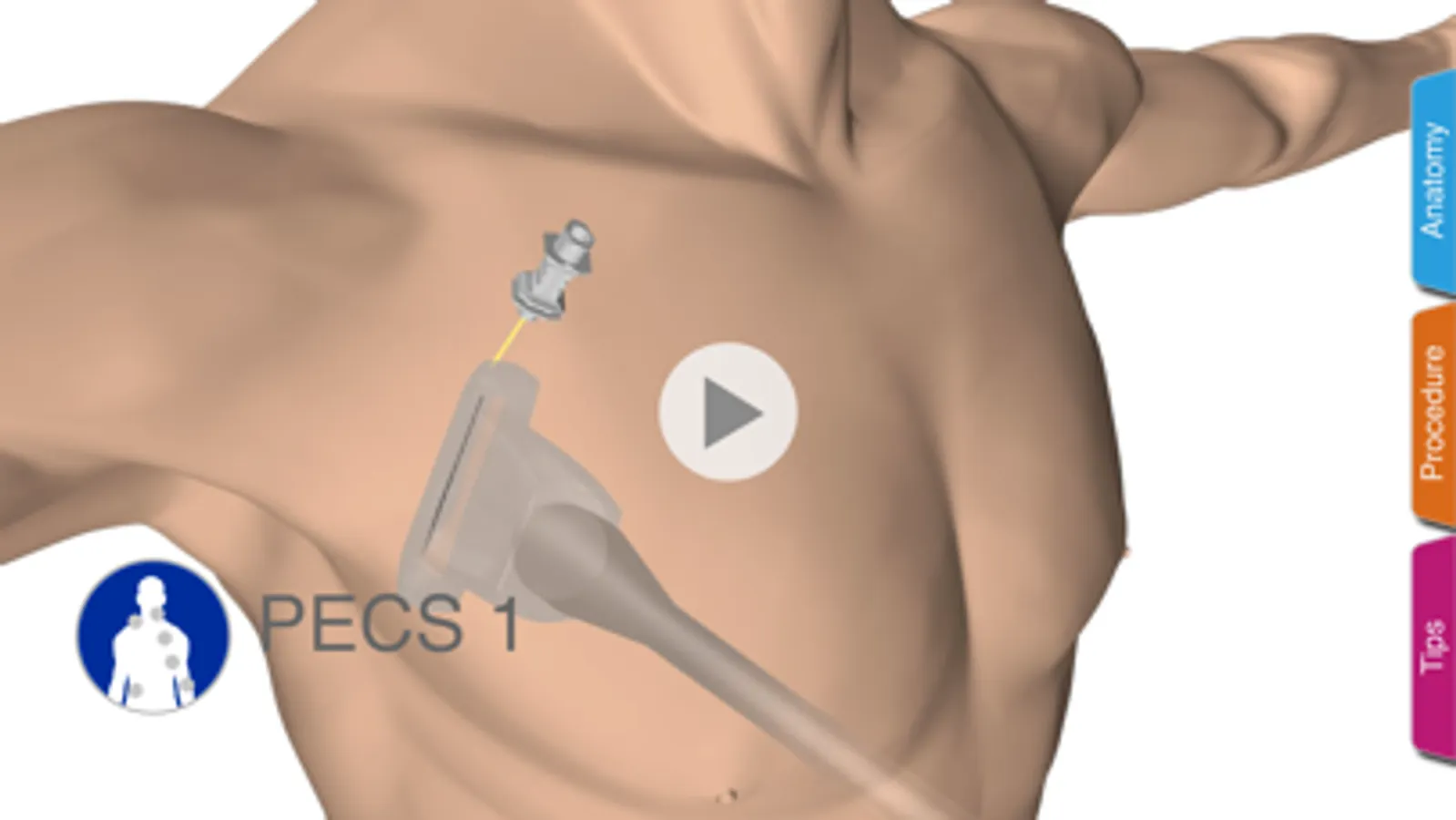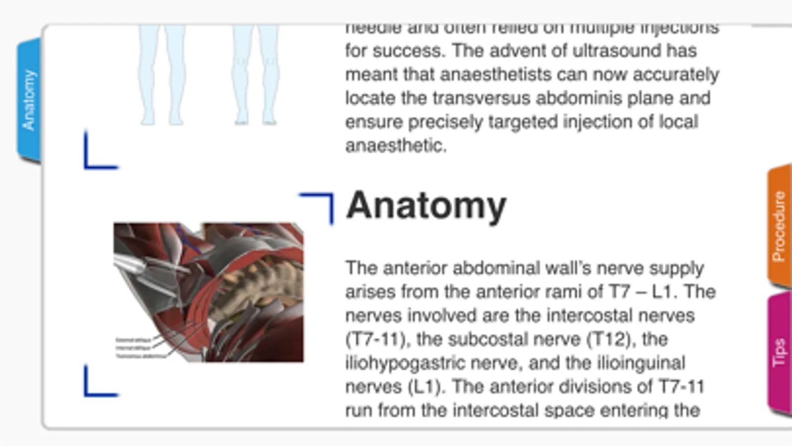 A tab system gives the user access to anatomy, procedure, tips and equipment. The anatomy tab gives an overview of anatomy related to the specific block, it includes schematic diagram’s which can be expanded to full screen. The procedures tab is a full pictorial and text guide to the performance of the specific block, including annotated ultrasound screen captures to help visualise nerves. The tips tab contains useful advice related to the selected block, also included is advice on the use of ultrasound and local anaesthetics.
