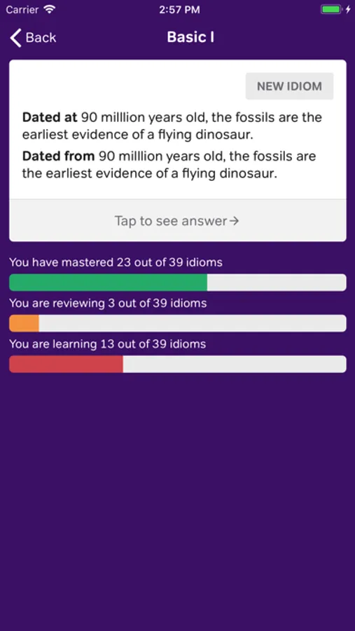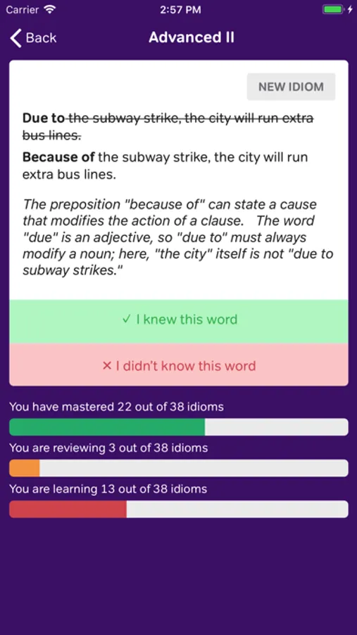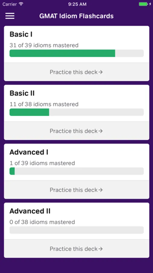 Academic research has found that memories are formed by repeated exposure to new information, so Magoosh’s flashcard app uses a spaced repetition system to help you in your preparation. Concepts you are learning will reappear frequently (occurring less frequently the better you know them) and concepts you already know won’t be repeated. The list is also culled to only 160 idioms so that you don't waste time learning unimportant ones for the SC section.