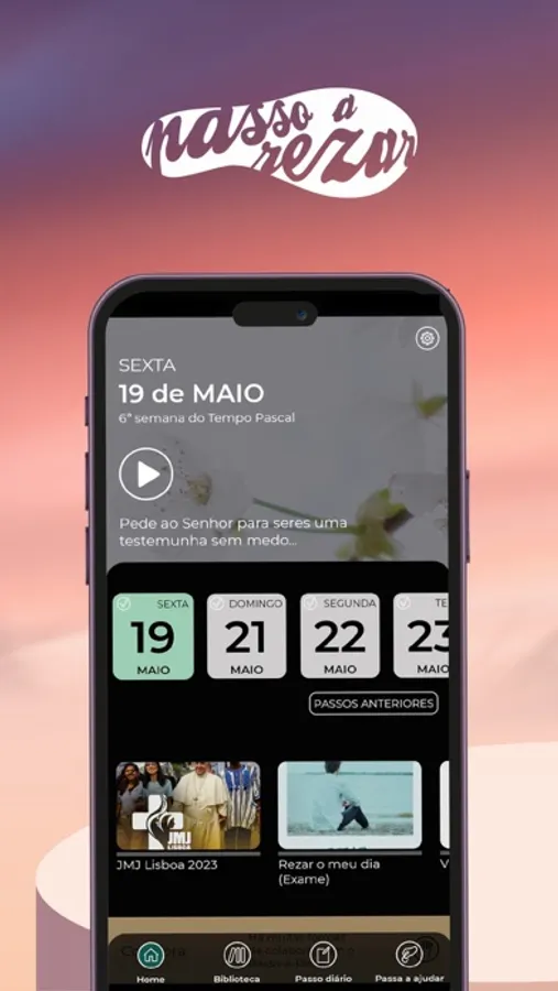 A caminho do trabalho, passeando pelo campo, enquanto fazes exercício, ou para melhor aproveitar aquele momento em que te sentas no cadeirão preferido da tua casa, podes rezar sem deixar o que estás a fazer. É para isso que te oferecemos o Passo-a-Rezar!