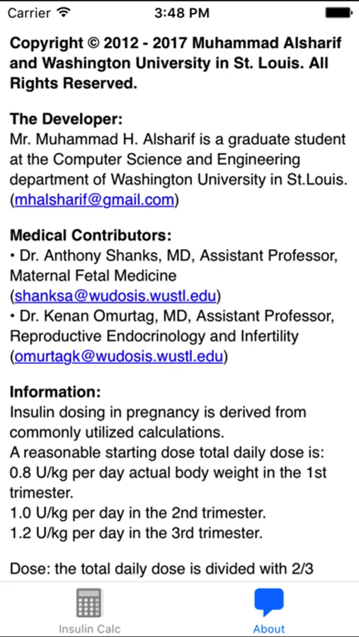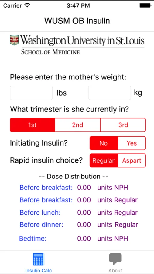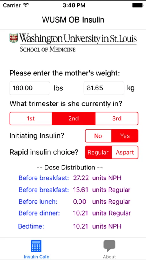 A quick and easy calculator to determine a starting dose for a pregnant woman requiring insulin. Using known protocols, users input maternal weight and the trimester to calculate the dose of both long and short acting insulins. Users can even select between regular insulin and faster acting medications.