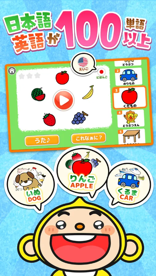 お子様が親しみやすい単語や、身の回りで見かける言葉を中心に全10セット・55単語を、「にほんご」「えいご」の2モード分収録