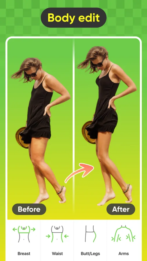 With a powerful photo editor and slimming app RetouchMe, you can reshape your body, correct facial features, apply cosmetic makeup, and remove any unwanted objects from your image. Smoothen your skin and fix your selfies with our professional editing app. It helps to reshape your body, making it more toned, moreover, RetouchMe will make your legs slim with just one click.