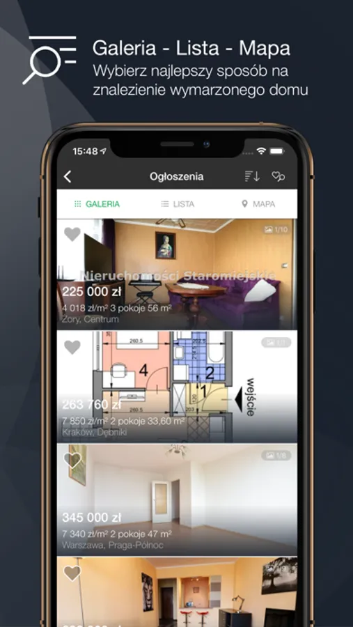 • Sortowanie listy wyników wyszukiwania po: cenie, powierzchni i aktualności ogłoszenia.