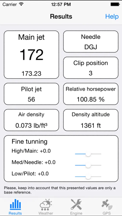 - Results: in this tab, the recommended jetting is shown. It's calculated depending on the weather conditions and the engine and track configuration given in the next tabs. For the jetting setup, the following values are given: main jet, needle type and clip position and pilot jet. Under the recommended main jet, the calculated real value with decimals is shown. It assumes the usage of a #6 slide. Besides this jetting information, the air density and density altitude are shown too. In addition, this tab lets do a fine tunning adjustment for the main (high), needle (mid) and pilot (low) circuits for the jetting setup to adapt to the concrete engine. These values will be stored and used in the future sessions.