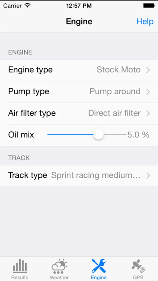 - Engine: you can set in this screen the information about the engine, that is, the class (Stock Moto or Mod Moto), the air filter type (clamp-on air filter, airbox with or without filter), the fuel feed system (pump-around, non pump-around), the oil mix ratio and the type of the circuit (spring or road racing, short or long). Depending of the track type, the jetting setup will be adapted.