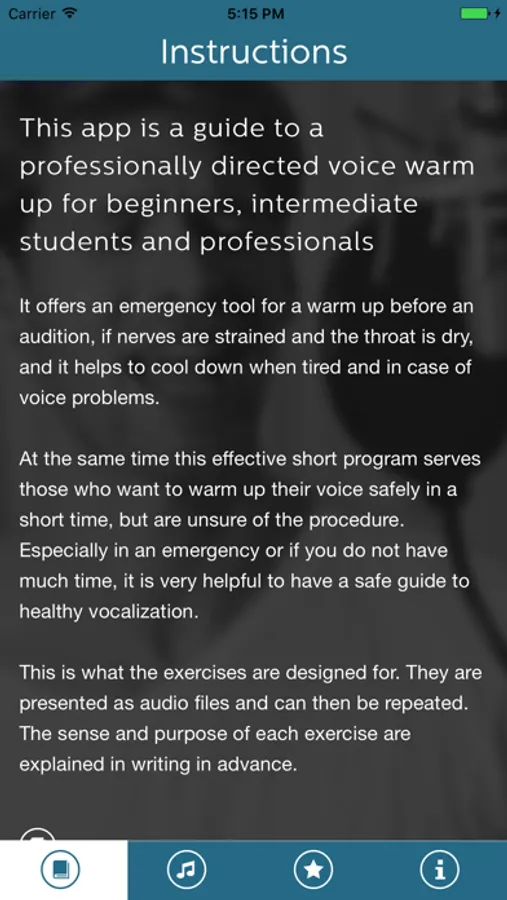 This app is a guide to a professionally directed voice warm up for beginners, intermediate students and professionals.