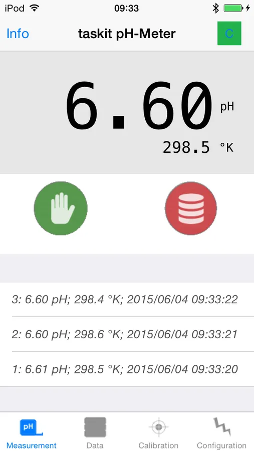 The pH-Meter application measures, displays and stores pH, voltage, and temperature values of a pH-electrode connected to the taskit pH-Meter accessory.