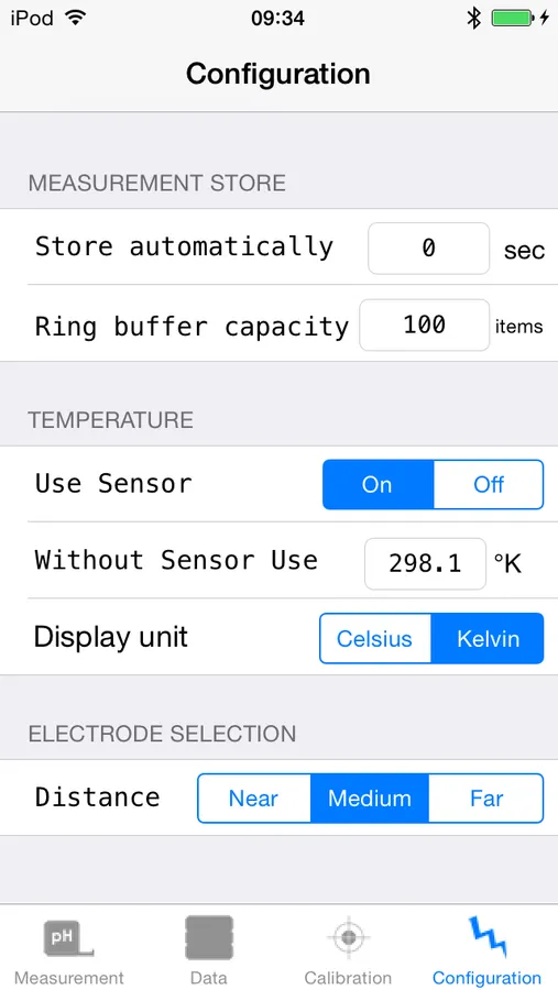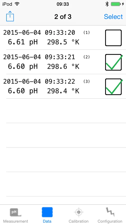 All stored readings (pH, voltage, temperature, location and time) can be viewed in a table, sent by e-mail or imported via iTunes as a csv file on the PC.